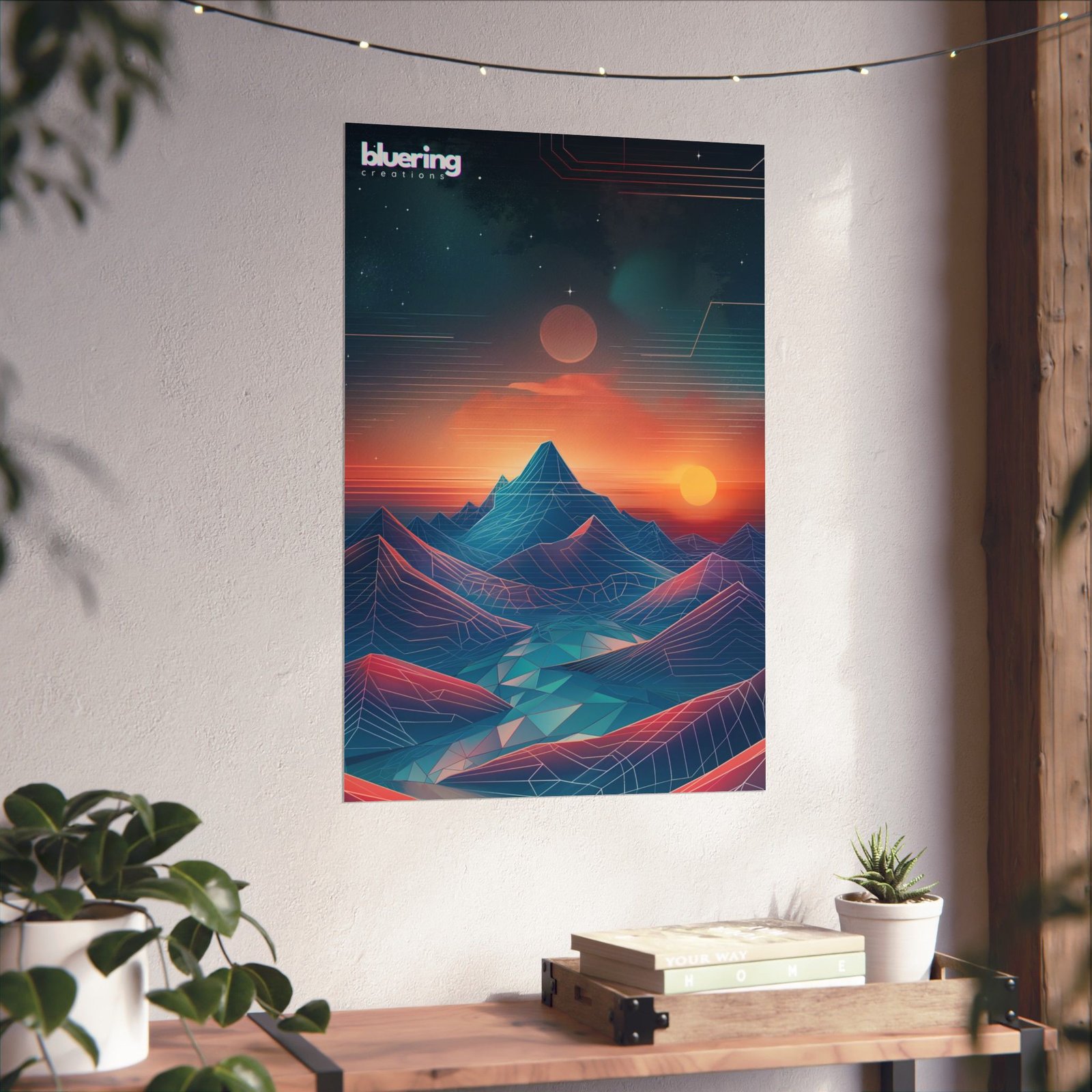 A matte vertical poster that turns a wall into a late-night horizon: layered geometric mountains in deep navy and teal, glowing sun and halo in molten orange and pink, and a star-scattered sky that feels both retro and futuristic. The muted matte surface keeps reflections low and draws attention to the color gradients and fine line details. Hang it in a living room alcove, over a desk, or inside a cozy reading corner to bring a calm, cinematic energy and a subtle pop of color without glare.