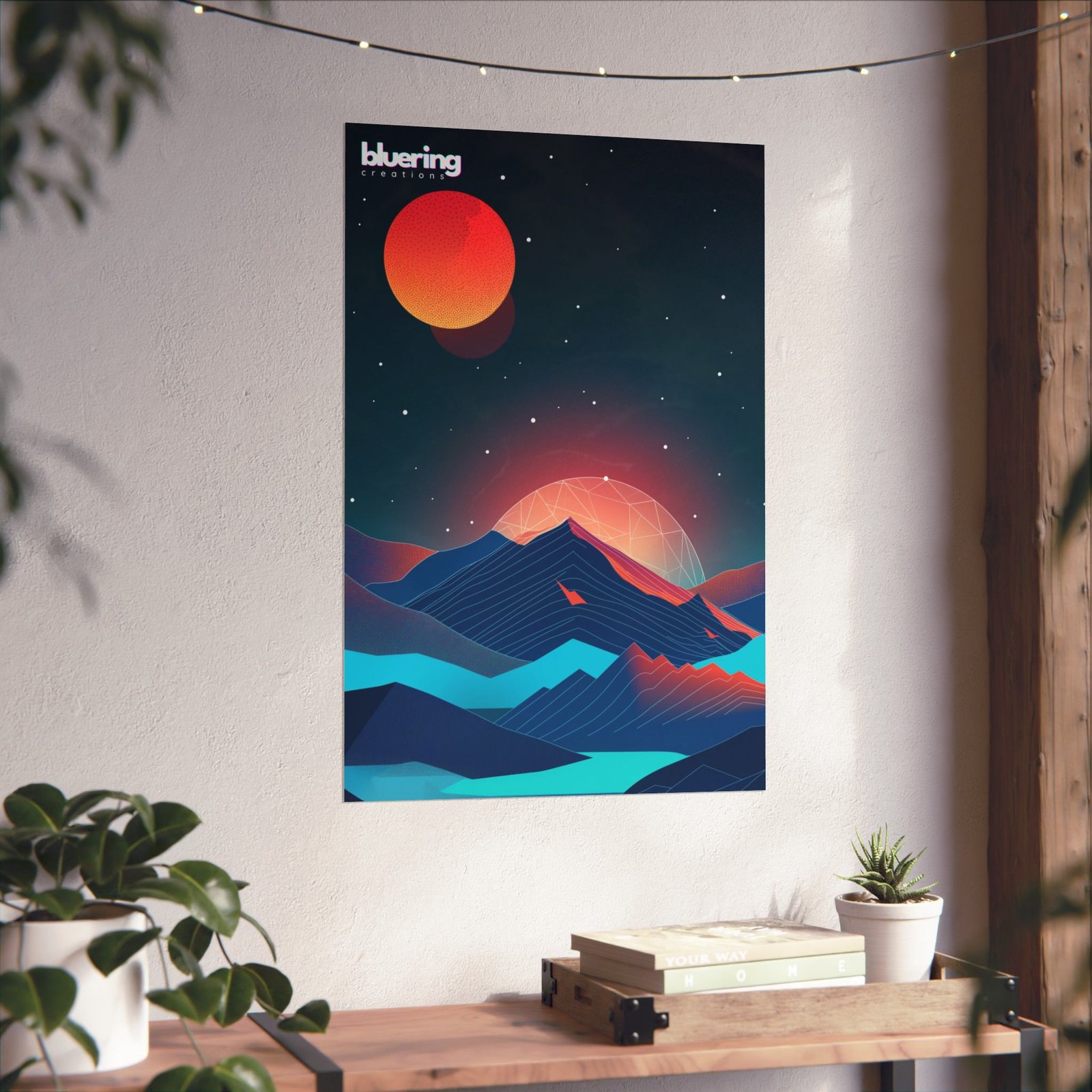 A matte vertical poster that turns a wall into a late-night horizon: layered geometric mountains in deep navy and teal, glowing sun and halo in molten orange and pink, and a star-scattered sky that feels both retro and futuristic. The muted matte surface keeps reflections low and draws attention to the color gradients and fine line details. Hang it in a living room alcove, over a desk, or inside a cozy reading corner to bring a calm, cinematic energy and a subtle pop of color without glare.