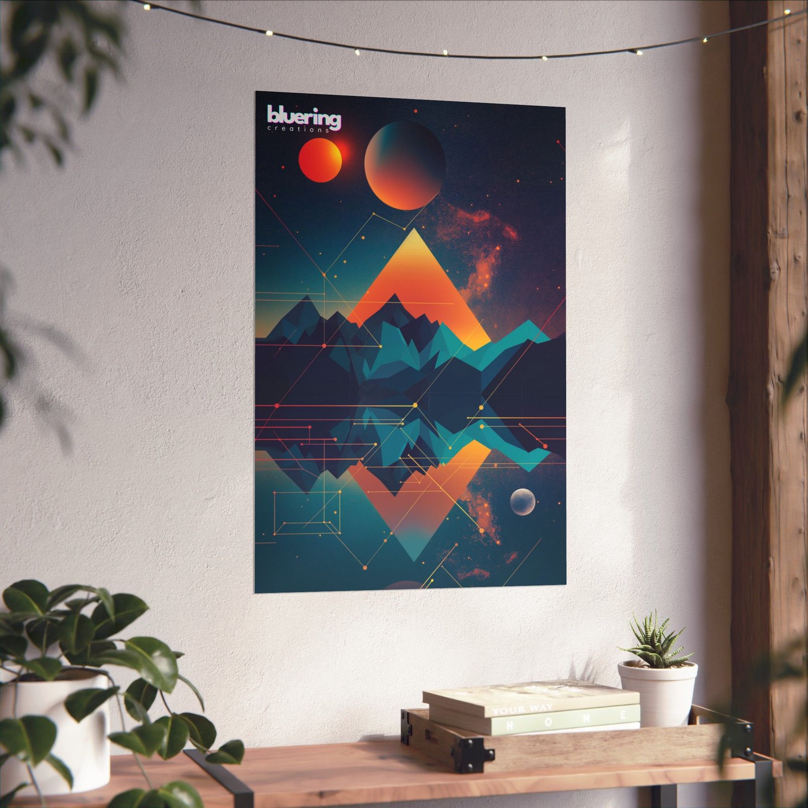 A matte vertical poster that turns a wall into a late-night horizon: layered geometric mountains in deep navy and teal, glowing sun and halo in molten orange and pink, and a star-scattered sky that feels both retro and futuristic. The muted matte surface keeps reflections low and draws attention to the color gradients and fine line details. Hang it in a living room alcove, over a desk, or inside a cozy reading corner to bring a calm, cinematic energy and a subtle pop of color without glare.