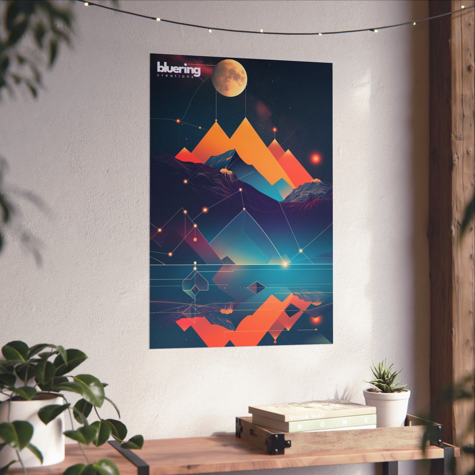 A matte vertical poster that turns a wall into a late-night horizon: layered geometric mountains in deep navy and teal, glowing sun and halo in molten orange and pink, and a star-scattered sky that feels both retro and futuristic. The muted matte surface keeps reflections low and draws attention to the color gradients and fine line details. Hang it in a living room alcove, over a desk, or inside a cozy reading corner to bring a calm, cinematic energy and a subtle pop of color without glare.
