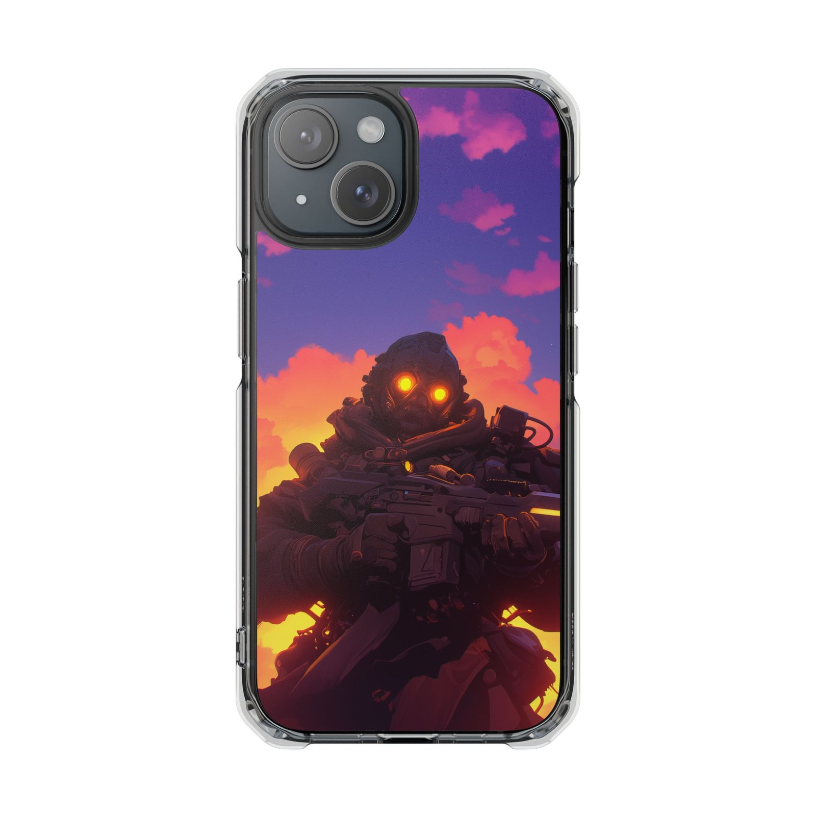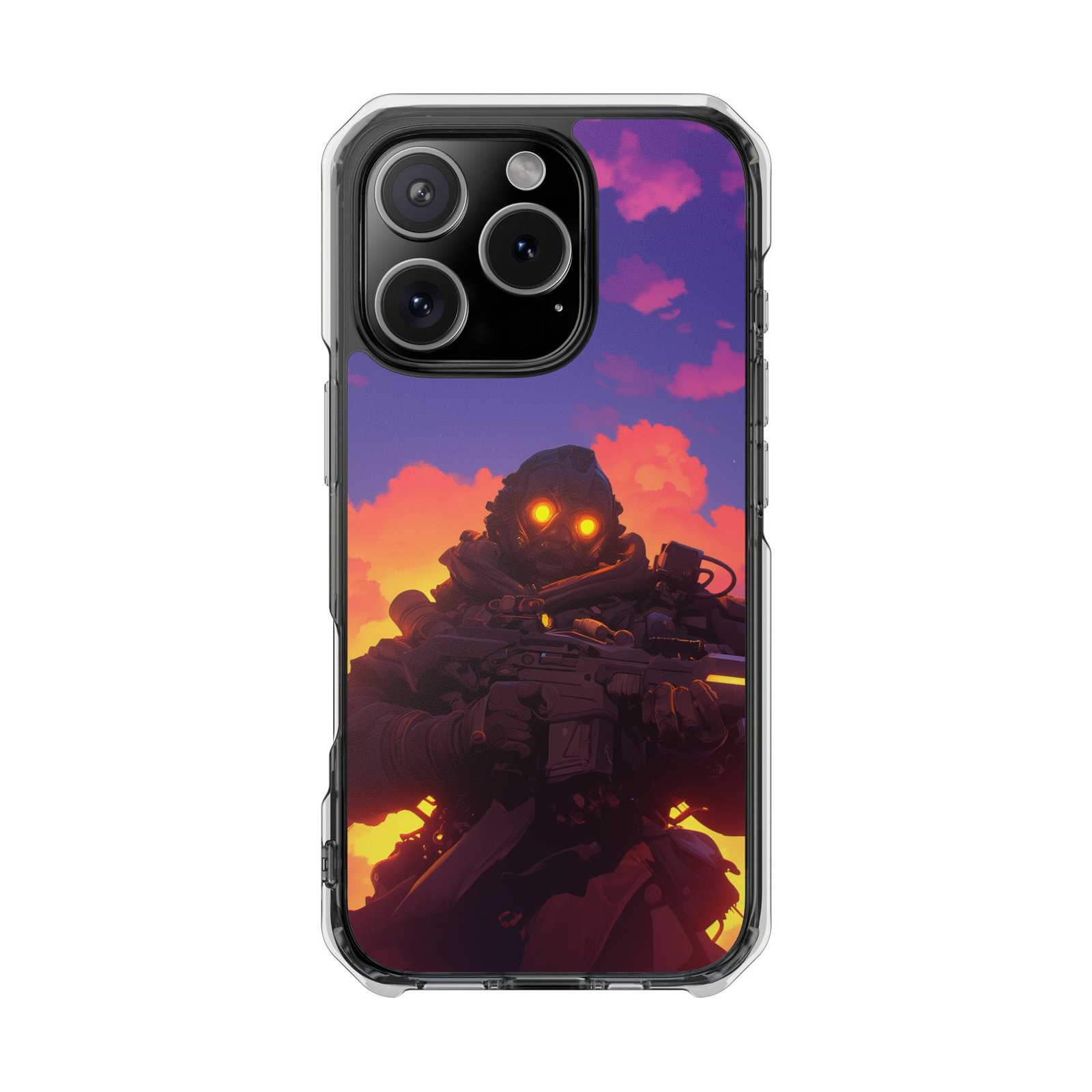 High Tech Space Soldier themed iPhone Tough Phone Case with vibrant colors and MagSafe compatibility. Provides elegant and subtle protection with air-cushioned bumper corners. Perfect for tech enthusiasts and those who love futuristic designs. Ideal for gifting on birthdays, Christmas, and other special occasions.