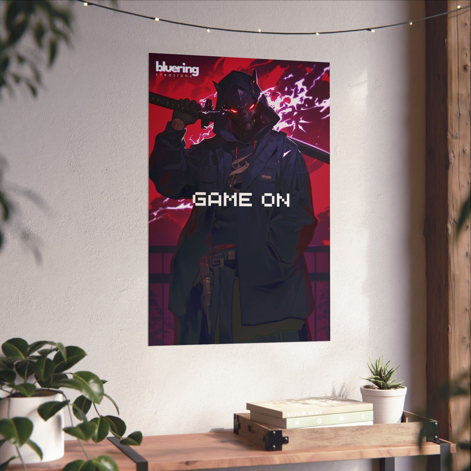This matte vertical poster brings a pulse of neon-drenched cyber-noir into a room. A masked, katana-wielding figure stands under electric pink lightning, eyes glowing behind a sleek helmet while the blocky “GAME ON” text cuts across the composition. Printed on archival museum-grade paper with giclée inks, the matte finish soaks up glare and keeps colors vivid without shine. Hang it in a gaming nook, studio wall, or dorm room to inject cinematic tension and late-night energy — it reads like a scene frozen between rounds, a reminder to gear up and dive back into the fight.