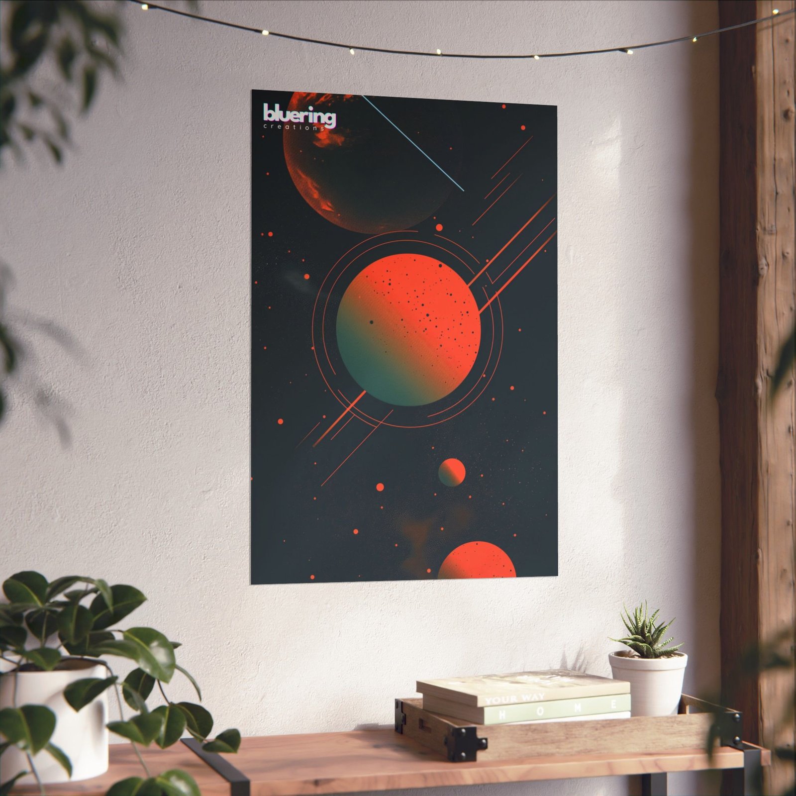 Bring a moody, retro-futuristic skyline into your room with this matte vertical poster. Deep charcoal blacks and warm coral-oranges sit in high-contrast balance—planets, rings, and starlit specks arranged like a handcrafted cosmic study. The matte finish keeps glare low and the tones soft, so the image reads like a print you’d discover in a quiet studio or late-night record shop. Hung above a desk, bedside table, or gallery wall, it quietly anchors a space with a sense of wonder and low-key sci-fi cool.