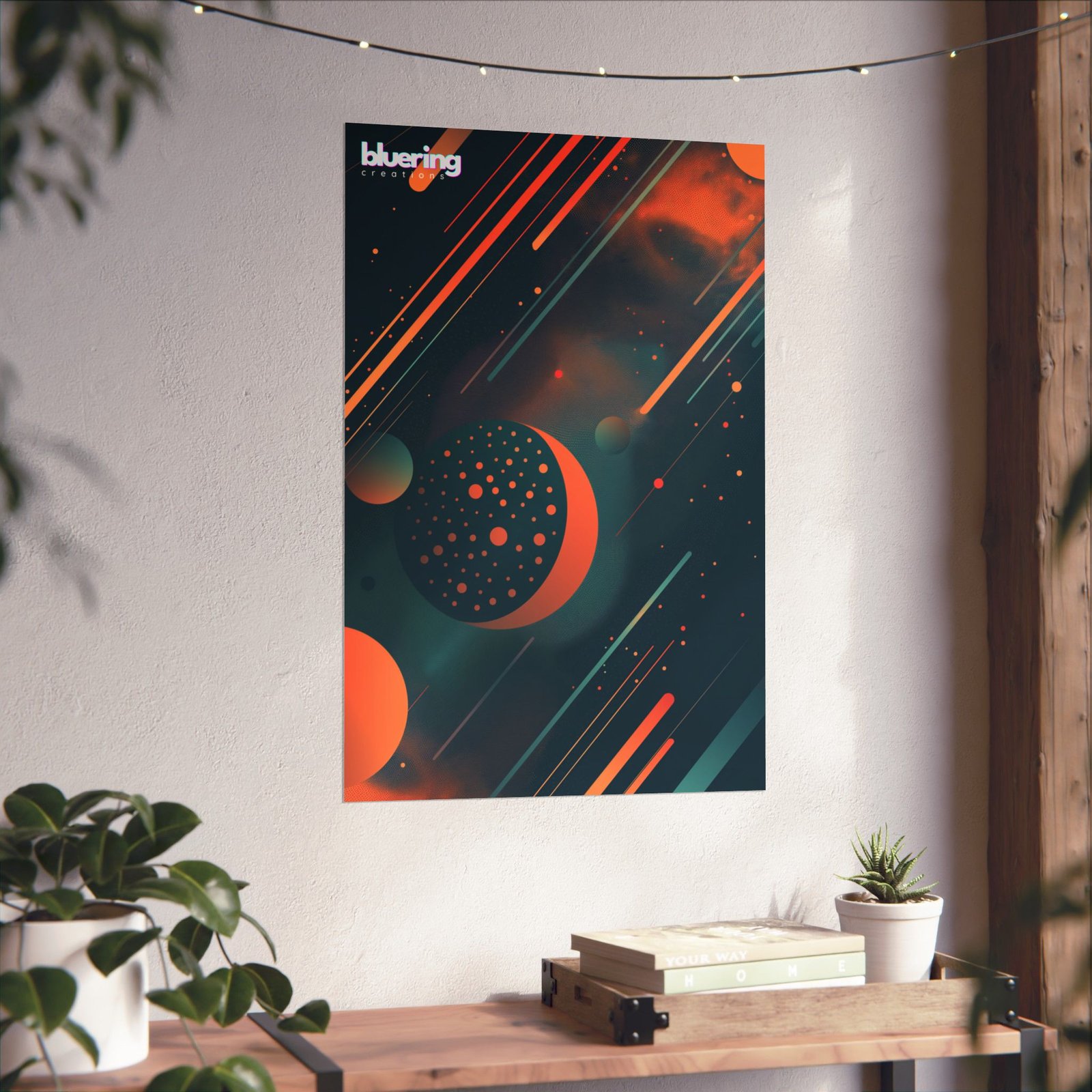 Bring a moody, retro-futuristic skyline into your room with this matte vertical poster. Deep charcoal blacks and warm coral-oranges sit in high-contrast balance—planets, rings, and starlit specks arranged like a handcrafted cosmic study. The matte finish keeps glare low and the tones soft, so the image reads like a print you’d discover in a quiet studio or late-night record shop. Hung above a desk, bedside table, or gallery wall, it quietly anchors a space with a sense of wonder and low-key sci-fi cool.