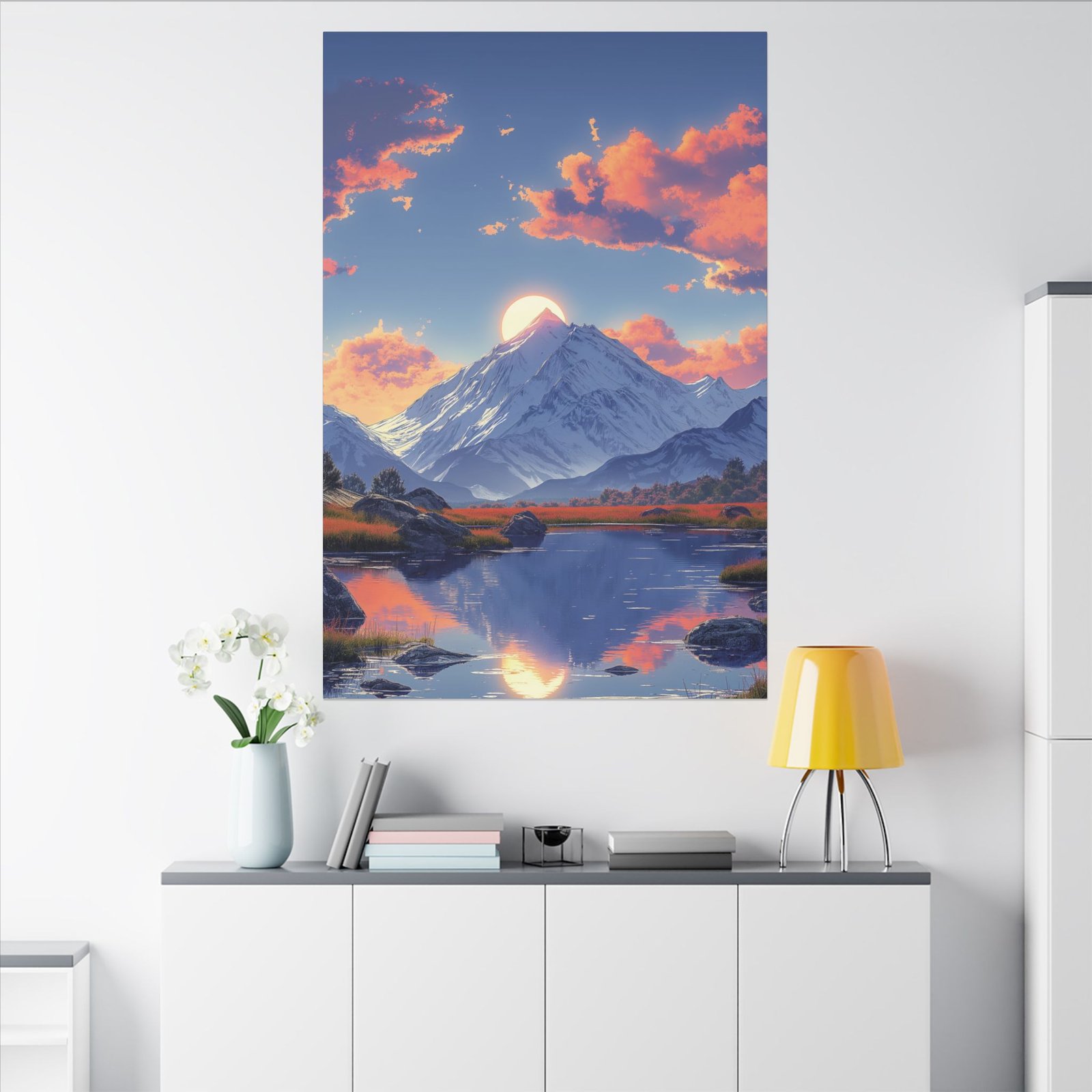 Sunrise Golden Hour Snowy Moutain View Matte Canvas | Nature | Lake Reflection | Morning Sun | National Park